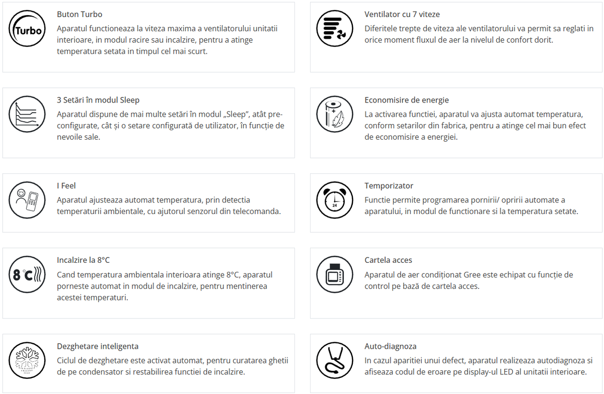 Viteza ventilatorului cu 7 viteze poate fi ajustata cu usurinta din telecomanda.In treapta Turbo, temperatura camerei se modifica imediat si va da posibilitatea sa va bucurati rapid de racoare, in timp ce, la viteza minima, va puteti destinde intr-o ambianta placuta, in liniste.