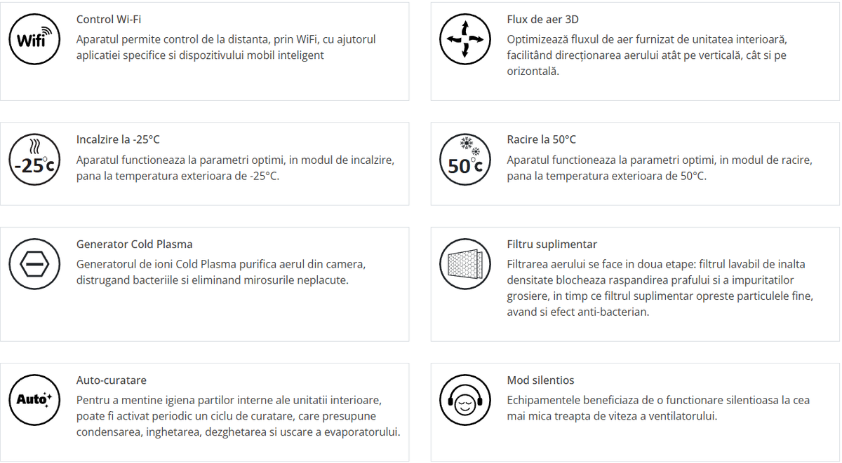 Prin filtrarea dubla si generatorul de ioni integrat, aerul eliberat in camera este curat si sanatos. Filtrul lavabil de inalta densitate blocheaza praful si impuritatile grosiere, in timp ce al doilea filtru elimina particulele fine, avand si efect anti-bacterian. Suplimentar, generaturul de ioni Cold Plasma realizeaza purificarea si dezodorizarea aerului din camera, prin distrugerea microorganismelor.