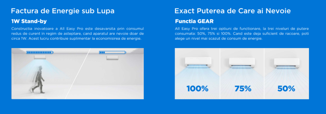 Poti racori rapid fiecare colt al camerei. Pozitionarea frontala a cutiei electrice si design-ul placii electronice elibereaza mai mult spatiu pentru grila de evacuare a aerului, astfel incat All Easy Pro are performante imbunatatite pentru racire, la un consum de energie mult mai mic. In regim de asteptare, aparatul are nevoie pentru alimentare de numai 1W.
