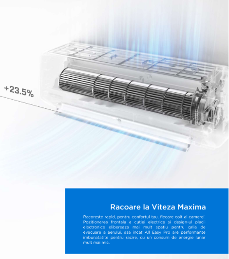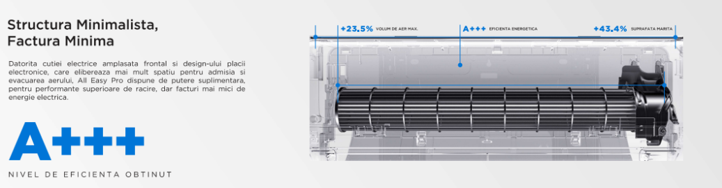 Designul minimalist al grilei de evacuare a aerului permite aparatelor All Easy Pro sa asigure un confort optim. Temperatura dorita este atinsa in cel mai scurt timp, cu fluctuatii minime ale nivelului de zgomot, atat in modul Silence, cat si la apasarea butonului Boost. In acelasi timp, volumul de aer emis este cu 23.5% mai mare fata de versiunile anterioare de unitati de aer conditionat.