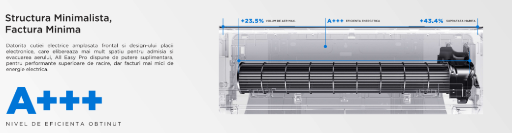 Designul minimalist al grilei de evacuare a aerului permite aparatelor All Easy Pro sa asigure un confort optim. Temperatura dorita este atinsa in cel mai scurt timp, cu fluctuatii minime ale nivelului de zgomot, atat in modul Silence, cat si la apasarea butonului Boost. In acelasi timp, volumul de aer emis este cu 23.5% mai mare fata de versiunile anterioare de unitati de aer conditionat.