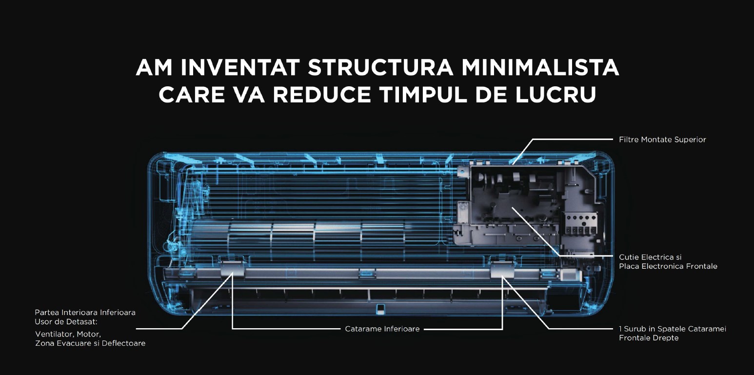 Datorita designului inovativ - care permite fixarea cu un singur surub - va dura doar un minut sa demontezi ventilatorul unitatii interne pentru curatare. Astfel, vei castiga timp si nu vei avea nevoie de serviciile unui tehnician calificat.