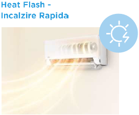 Prin fluxul de aer cald, rapid și puternic, tehnologia Heat Flash încălzește întreaga cameră într-un timp foarte scurt. Temperatura încăperii poate crește cu 10.4 grade Celsius în doar 10 minute.