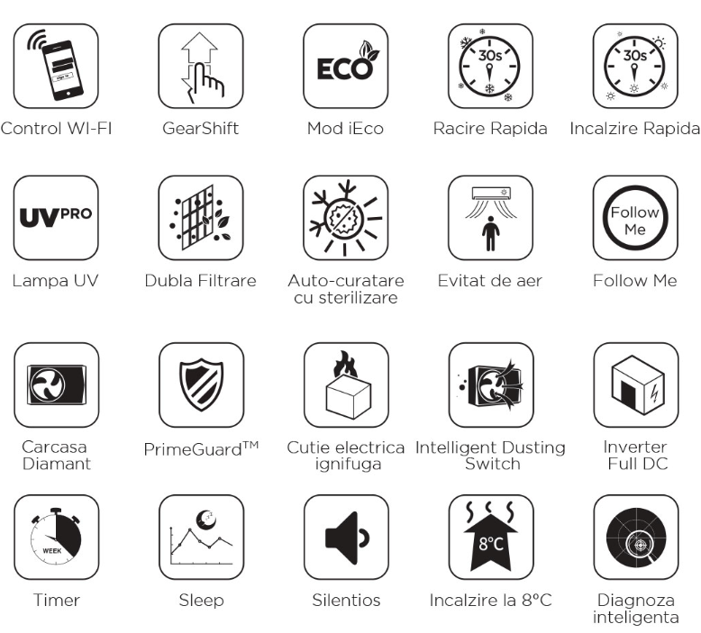 | Functii | Autodiagnoza, Incalzire, Ionizare, Purificare, Racire, Ventilatie |