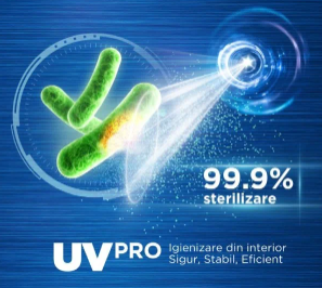 Lampa UV incorporata asigura curatarea aparatului de aer, de la interior. Prin activarea functionarii acesteia, partile interne ale unitatii interioare sunt sterilizate, eliminand virusii si bacteriile.