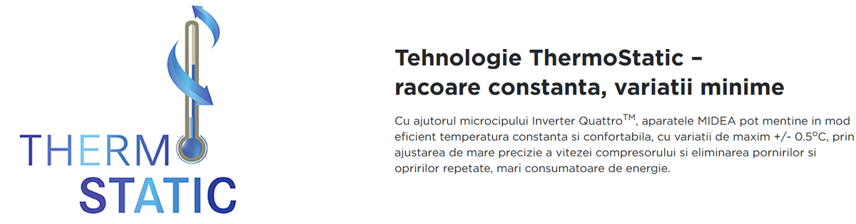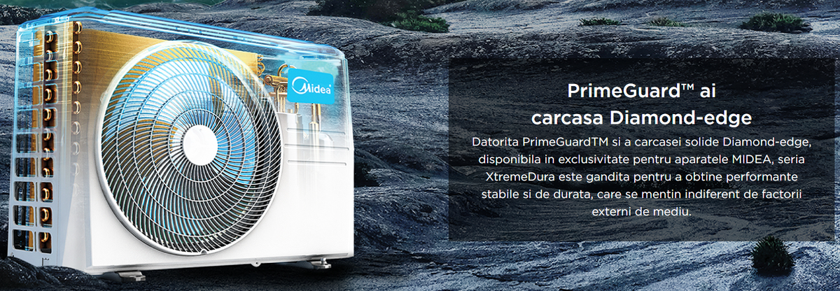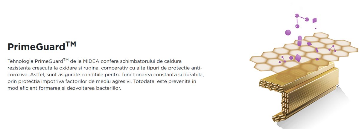 Tehnologia PrimeGuardTM de la MIDEA confera schimbatorului de caldura rezistenta crescuta la oxidare si rugina, comparativ cu alte tipuri de protectie anti-coroziva. Astfel, sunt asigurate conditiile pentru functionarea constanta si durabila, prin protectia impotriva factorilor de mediu agresivi. Totodata, este