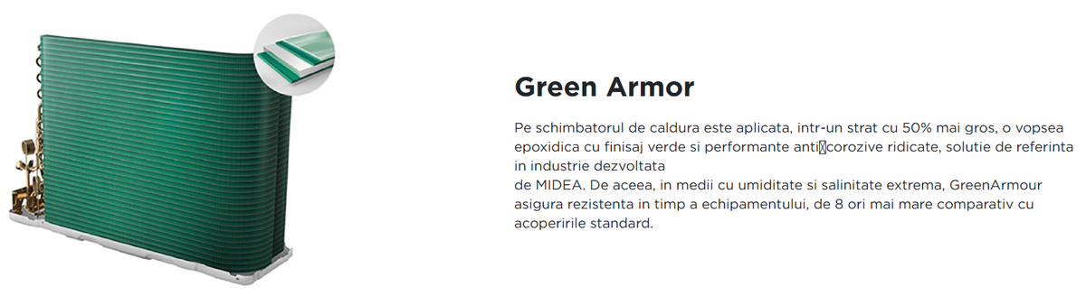Pe schimbatorul de caldura este aplicata, intr-un strat cu 50% mai gros, o vopsea epoxidica cu finisaj verde si performante anti?corozive ridicate, solutie de referinta in industrie dezvoltata de MIDEA. De aceea, in medii cu umiditate si salinitate extrema, GreenArmour asigura rezistenta in timp a echipamentului, de 8 ori mai mare comparativ cu acoperirile standard.