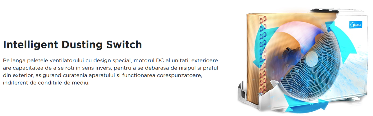 Pe langa paletele ventilatorului cu design special, motorul DC al unitatii exterioare are capacitatea de a se roti in sens invers, pentru a se debarasa de nisipul si praful din exterior, asigurand curatenia aparatului si functionarea corespunzatoare, indiferent de conditiile de mediu.