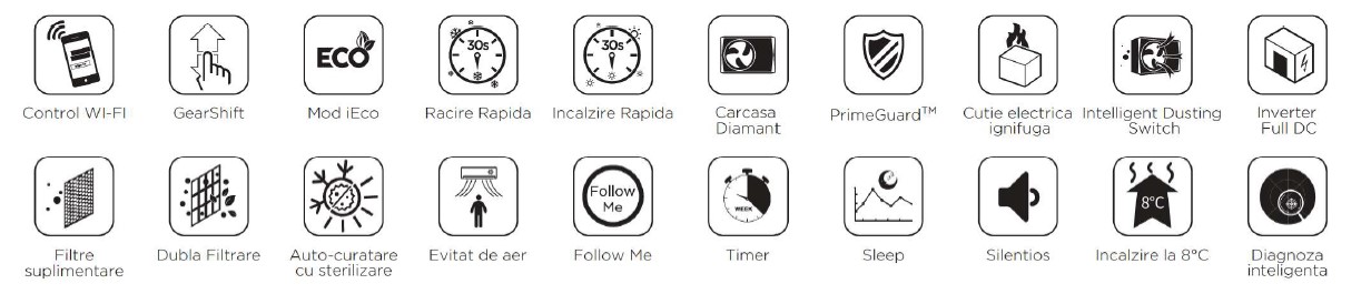 Folosind tehnologia High-frequency Racer, compresorul poate atinge intr-un timp foarte scurt o frecventa ultra-ridicata, asigurand racirea si incalzirea rapida. Tehnologie ThermoStatic - racoare constanta Datorita controlului precis al microcipului inverter Quattro aparatele Midea mentin in mod eficient temperatura constanta si confortabila Gear Shift Aparatele de aer conditionat Midea inverter ofera trei optiuni pentru consumul de energie: 50% 75% si 100%. Cand este deja suficient de racoare, puteti alege un nivel de putere mai scazut, prin apasarea butonului GEAR de pe telecomanda, economisind astfel energie. PrimeGuard Tehnologia Prime Guard confera schimbatorului de caldura rezistenta crescuta la oxidare si rugina, comparativ cu alte tipuri de protectie anti-coroziva Green Armour Pe schimbatorul de caldura este aplicata, intr-un strat